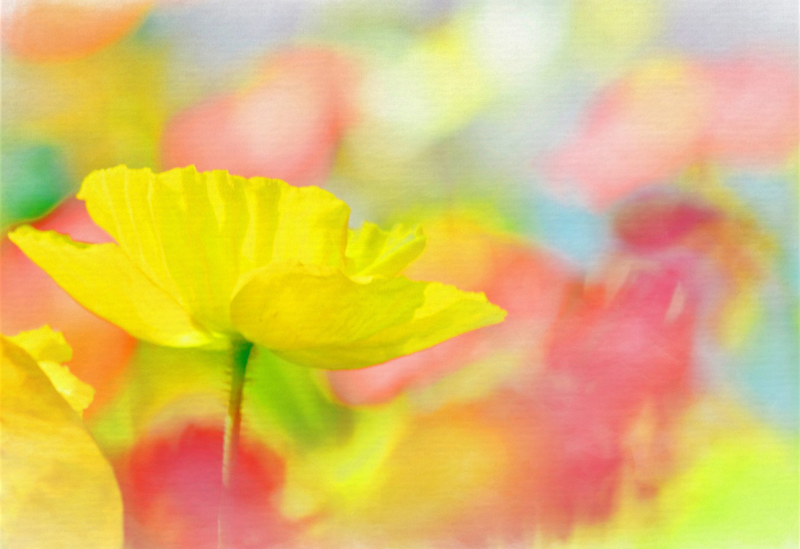 Intentionally blurry background image – Watercolour effect. A patch of colourful poppies, backlight.